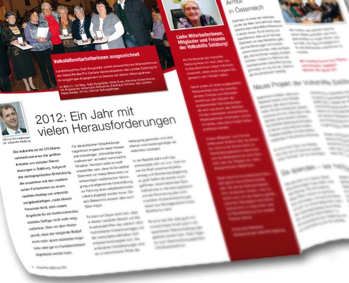 Die Volkshilfe Salzburg ist ein soziales Dienstleistungsunternehmen mit mehr als 1.200 Kunden und rund 270 MitarbeiterInnen. galcom hat nun das Layout für das neue Corporate Publishing Produkt "Volkshilfe Newsletter" gestaltet. Der gedruckte Newsletter soll künftig 4x jährlich ausgewählte Freunde der Volkshilfe und MitarbeiterInnen über aktuelle Themen und Neuigkeiten aus dem Unternehmen und der sozialen Dienstleistungsbranche informieren.